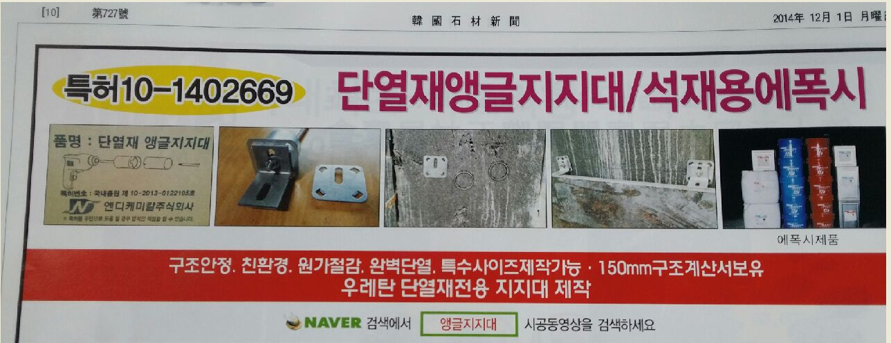 특허제품 '단열재 앵글 지지대' "한국석재신문"에 게재 12월 1일